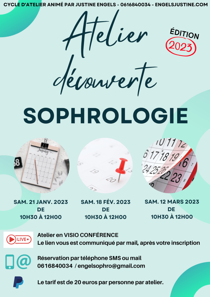 Cycle d’atelier animé par moi-même, réservation par SMS au 0616840034 ou par mail engelsophro@gmail.com