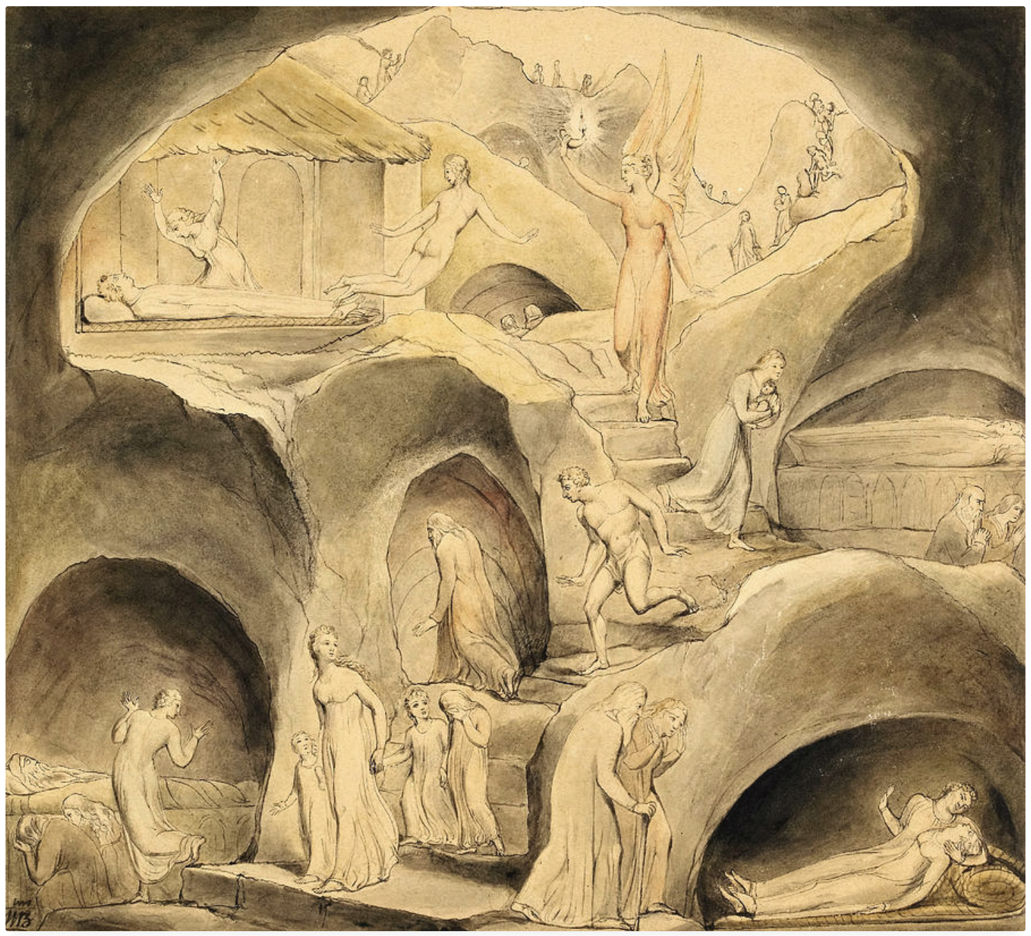 Dans l’illustration de Blake, la mort est dépeinte comme un monde souterrain dans lequel l’esprit des défunts descend avant que l’Espoir n’illumine la possibilité d’une demeure éternelle. Selon les mythes, les royaumes des profondeurs sont décrits comme le séjour d’ombres désincarnées soumises à des divinités chthoniennes, comme des enfers où brûle l’âme des damnés ou comme des réserves de trésors cachés dans les entrailles de la terre, avec leurs sols fertiles, leurs sources cristallines, leurs gemmes et leurs métaux précieux.