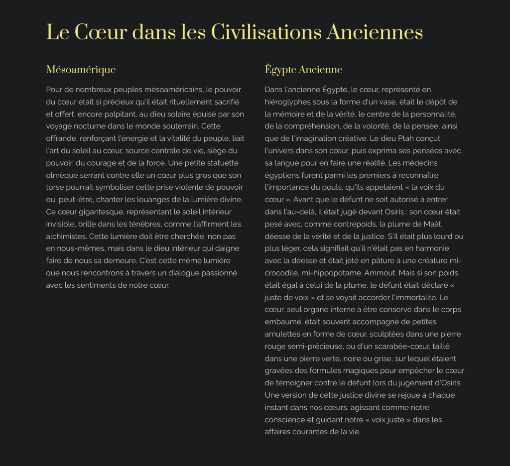 Dans cette chronique, je plonge dans les multiples significations du cœur à travers l’histoire : des sacrifices aztèques au Sacré-Cœur chrétien, en passant par les récits égyptiens où le cœur est jugé pour accéder à l’au-delà. 🔥💔